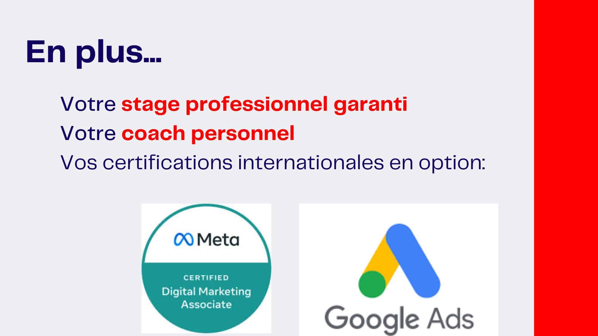 Mais maintenant… Quelle formation suivre? Quelle certification rechercher? pour les étudiants en communication, marketing, et même journalisme, c’est facile: le parcours-métier “Chargée de communication digitale” leur permet d’obtenir 4 certifications internationales et incontournables, et en plus d’exercer leur stage de 5 mois à distance, suivis par un coach.